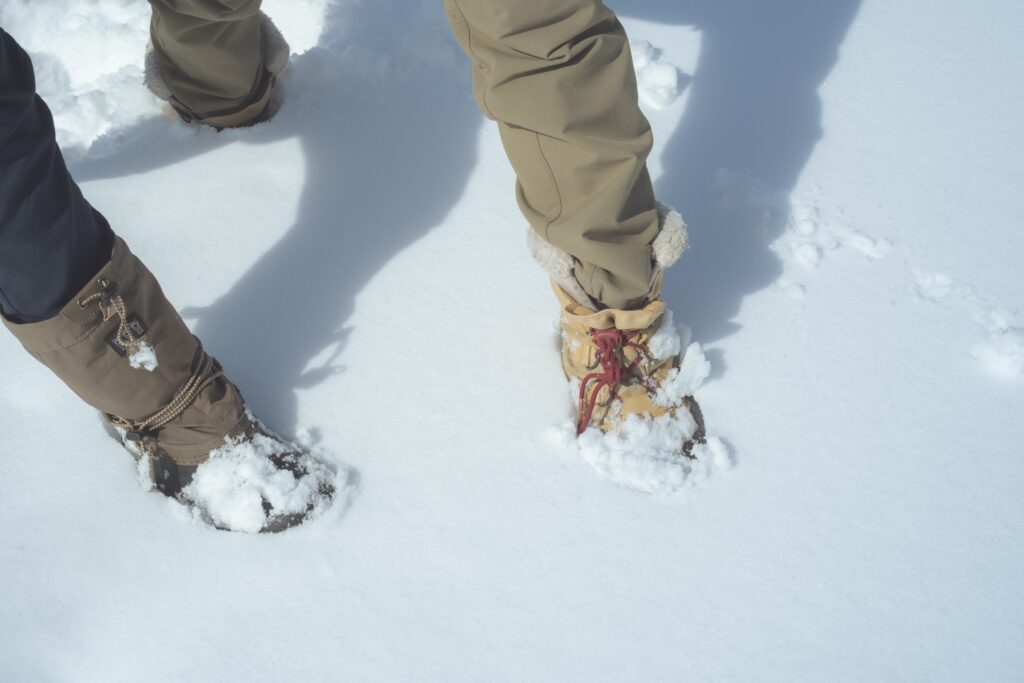 取材時、しっかり冬用のブーツで雪原を歩く窪谷さんと鹿島さんの足下。移住者であるふたりは、暮らす中で防寒対策を覚えていったと振り返る