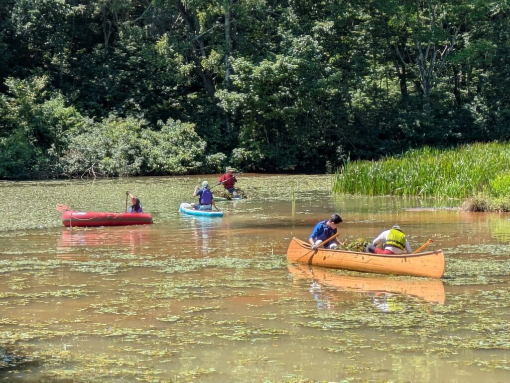 「癒しの森事業」の一環として、森のなかのコース整備に同行。カヌーに乗って池の水草を刈り取ることも(写真提供:癒しの森係)